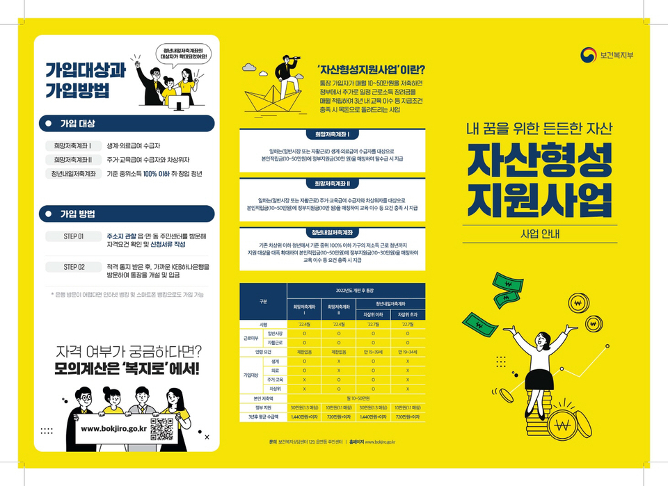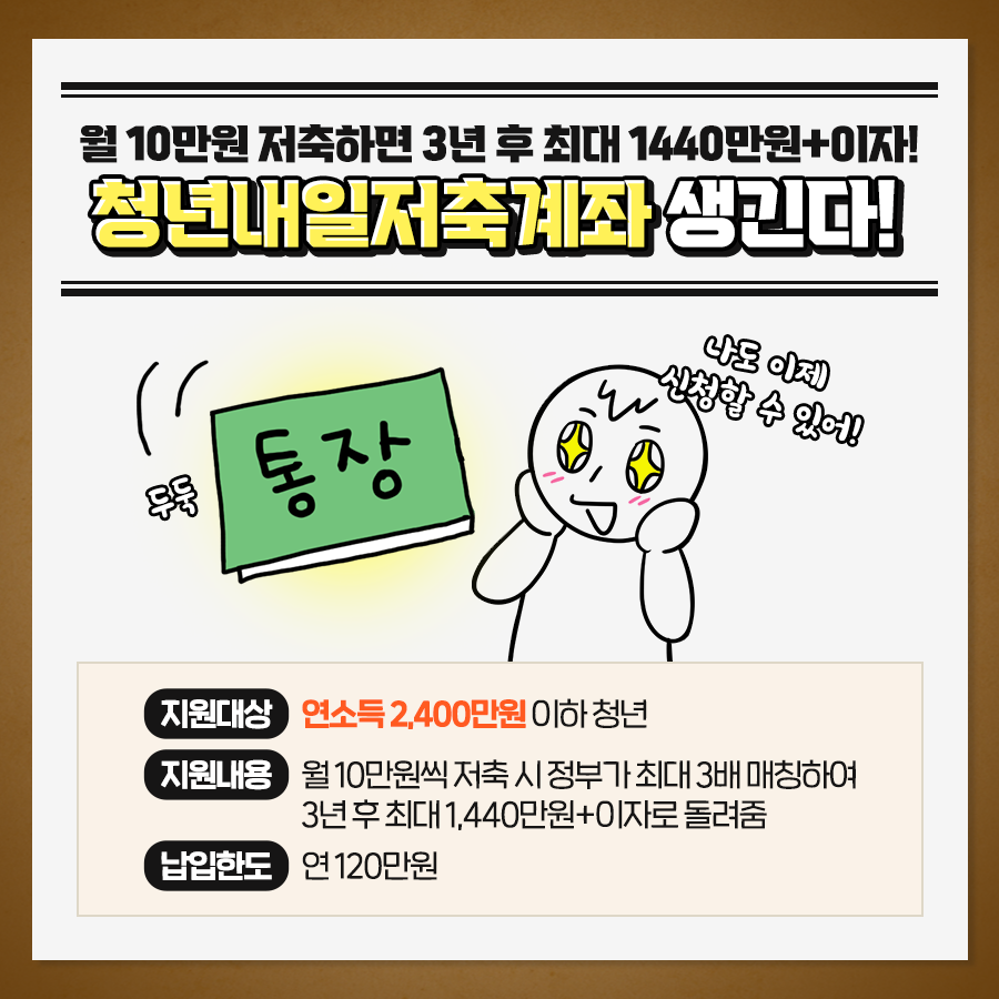 보건복지부에서 저소득층 청년을 대상으로 진행하는 자산형성제도입니다. 청년들이 월 10만 원을 3년 간 적립하면 정부 지원금 10만원 또는 30만원을 통해 만기시에 720만원 또는 1,440만원을 수령할 수 있는 정부지원계좌입니다. 코로나로 인해 더욱 삶이 피폐해지고 경제적으로 많은 어려움을 겪는 청년들이 많아졌기에 정부지원사업으로 청년들의 자산형성을 목표로 하고 있습니다.