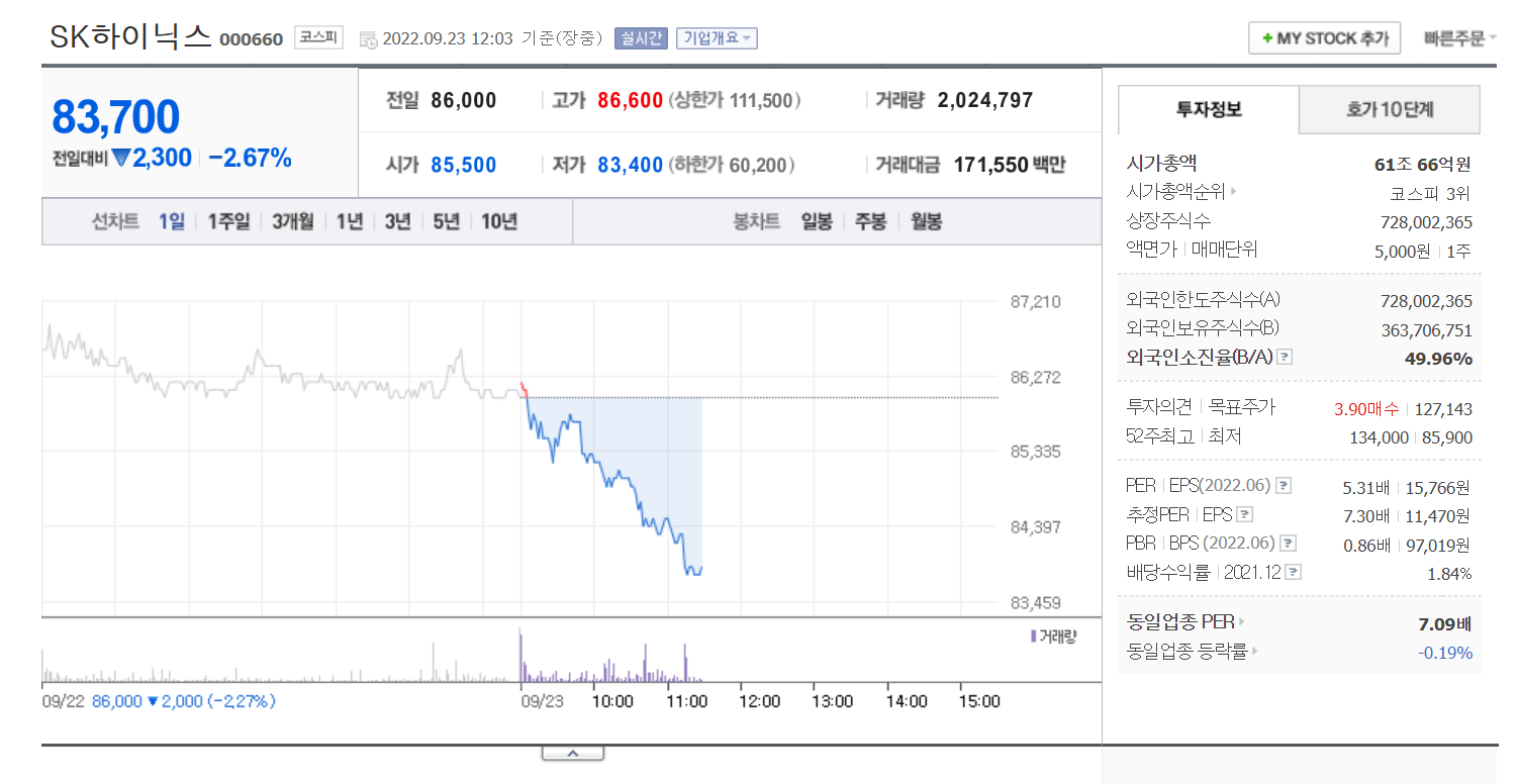 과연 반도체 주가가 어디까지 떨어질지 삼성전자와 함께 반도체 대표 주 SK하이닉스 주가 전망에 대해서 알아보자.